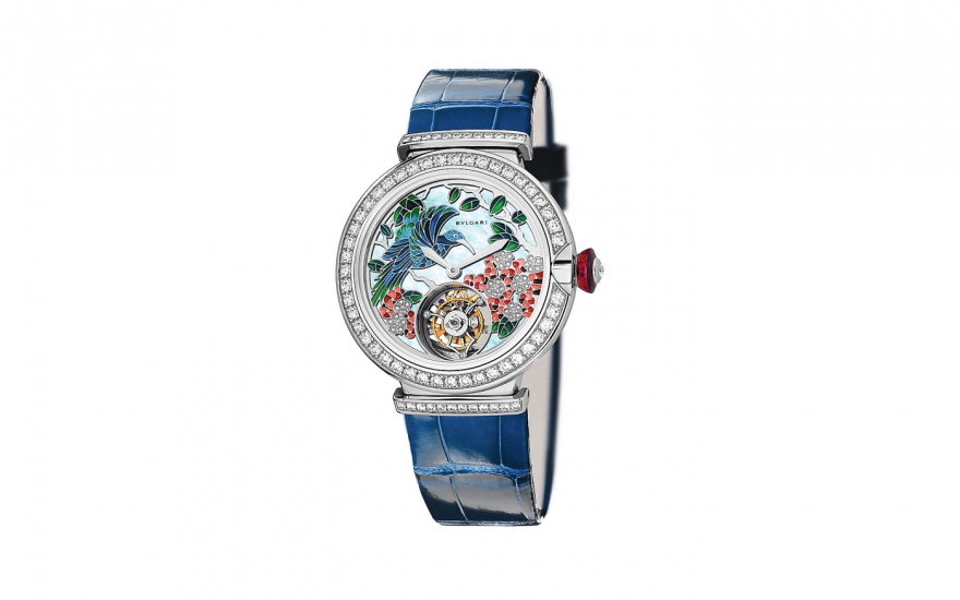 Окрашенная вручную райская птица кружит на циферблате Metiers d’art над гнездом, в которое ей удалось принести самое ценное в этом саду из прожилок белого золота и двух карат бриллиантов — турбийон. Он обеспечивает механическому калибру с 64-часовым запасом хода и автопод- заводом особую точность.
