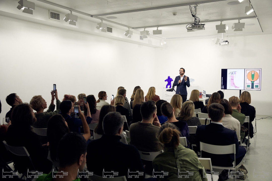 Писательница Ирина Оганова, инвестор Сергей Лимонов, основатель галереи Bulthaup Лина Перлова присмотрели несколько экземпляров в частную коллекцию, а затем отправились на лекцию о симбиозе искусства и моды от заведующего Отделом современного искусства Эрмитажа Дмитрия Озеркова.